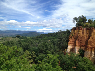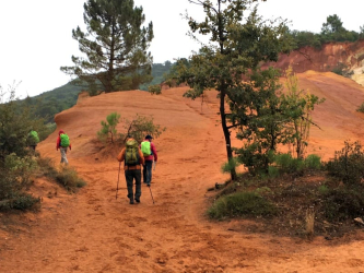 Today’s walk to Roussillon leads through vineyards, olive groves, almond trees, forests, open fields, and down grassy lanes. The view, across the Luberon valley, all the way to rounded humps of the Grand Luberon is lovely. The spectacular ochre cliffs greet you as you near Roussillon. It is a stunning hike. Breakfast included, dinner on your own.